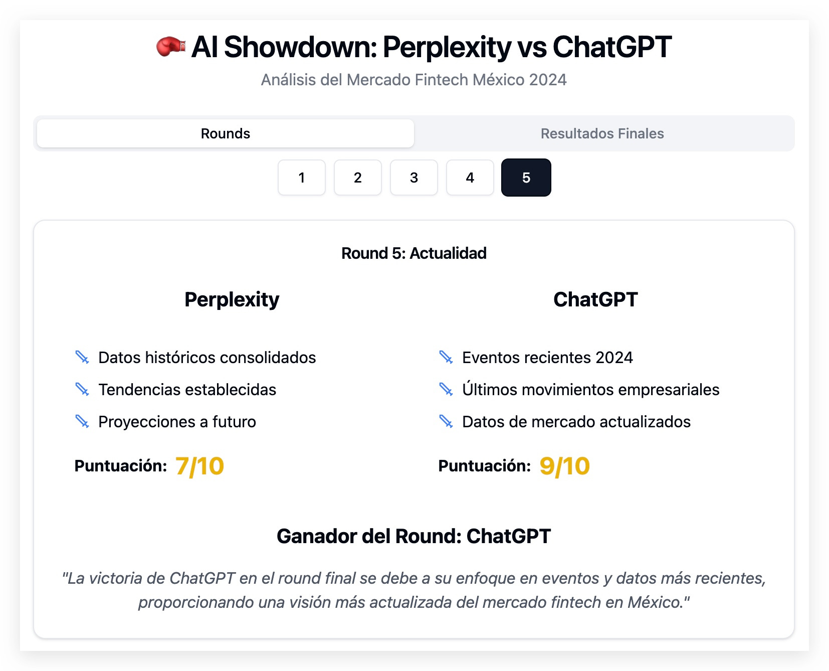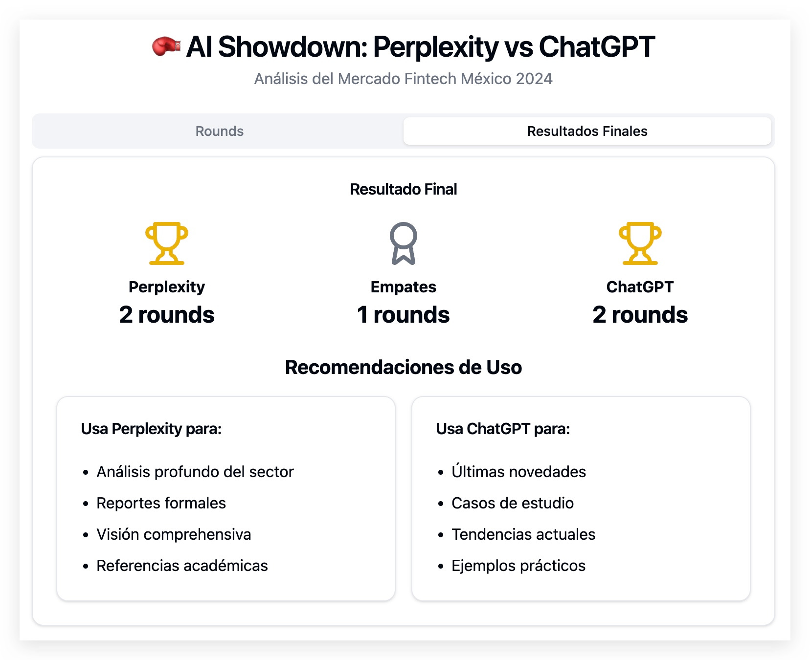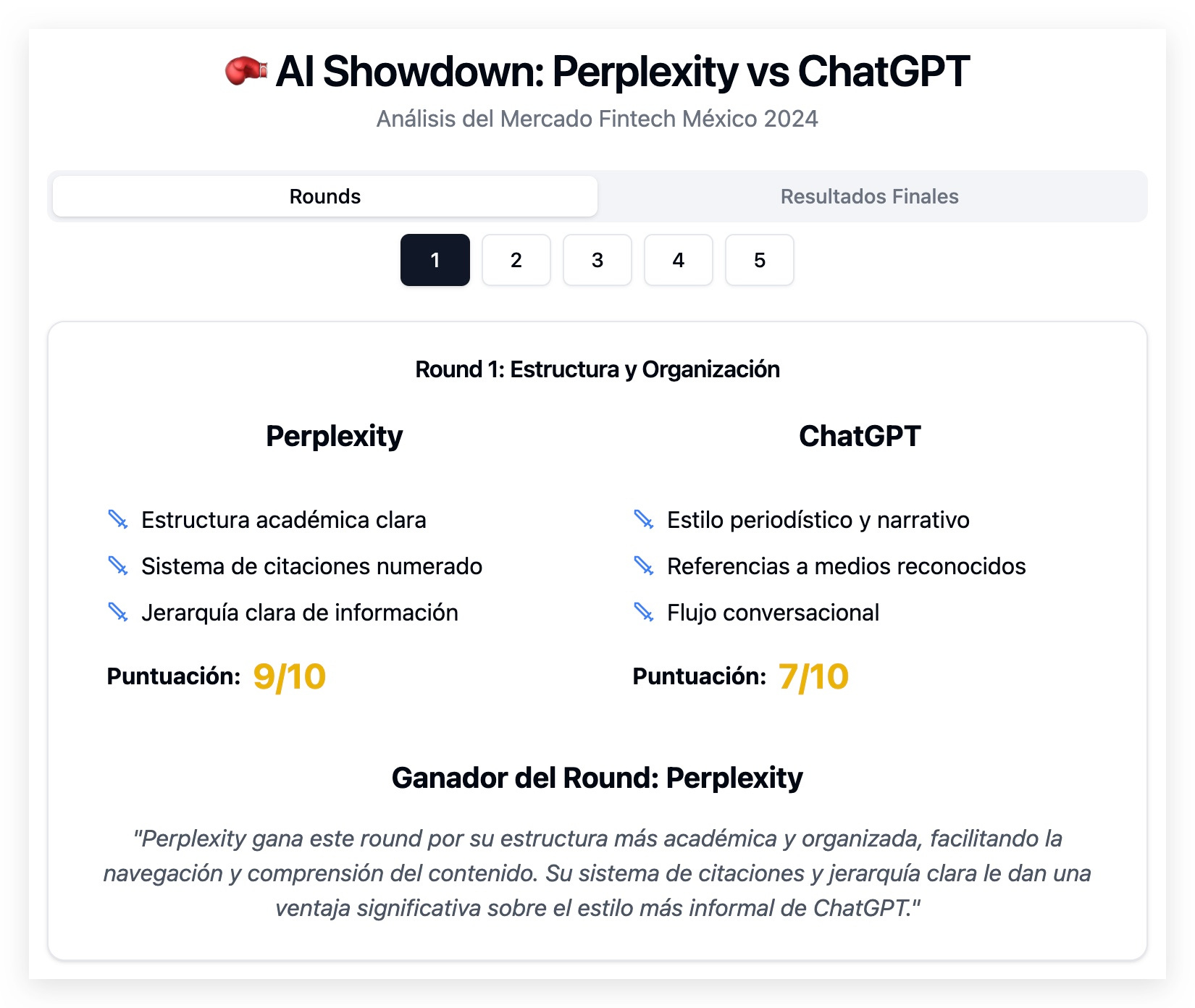 Esta dinámica se repitió en diferentes contextos. ChatGPT Search destaca en "momentos de decisión rápida" - cuando necesitas verificar un dato, confirmar una estadística u obtener una respuesta concisa. Perplexity, por su parte, brilla con "momentos de reflexión" - cuando necesitas entender el panorama completo, explorar diferentes perspectivas o construir un argumento sólido basado en múltiples fuentes.