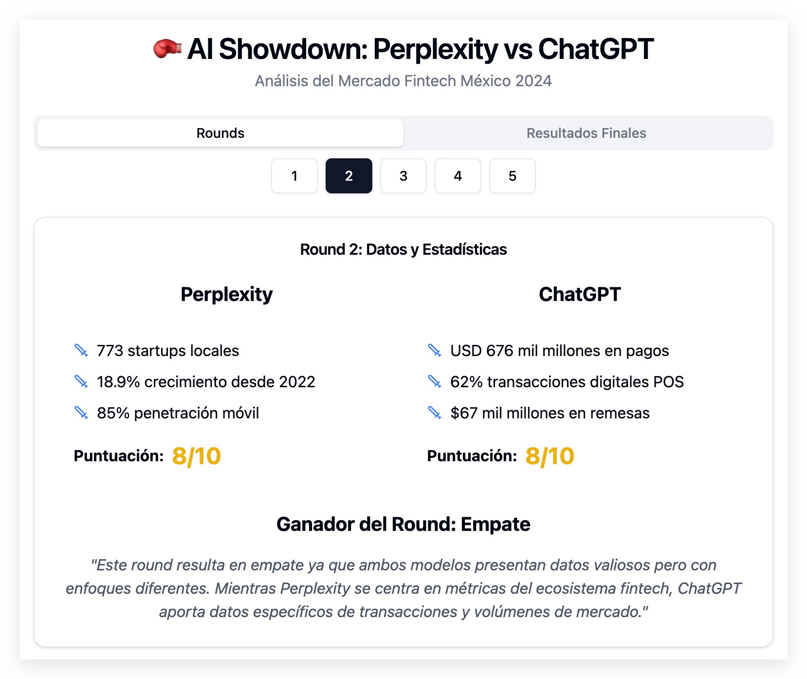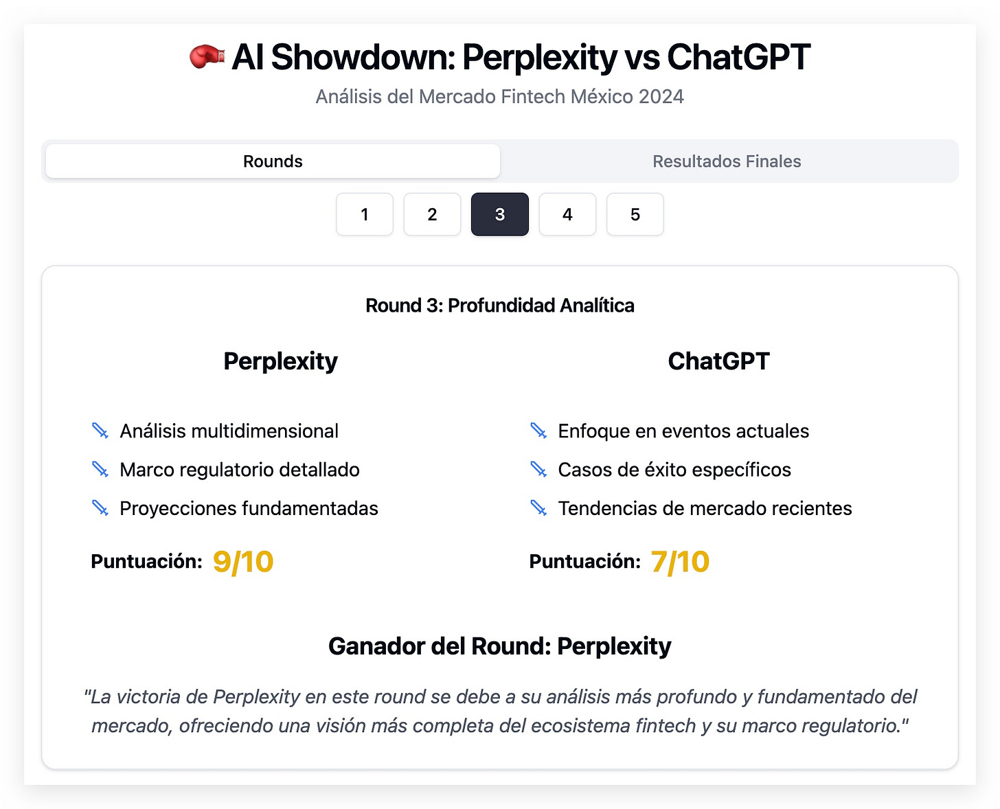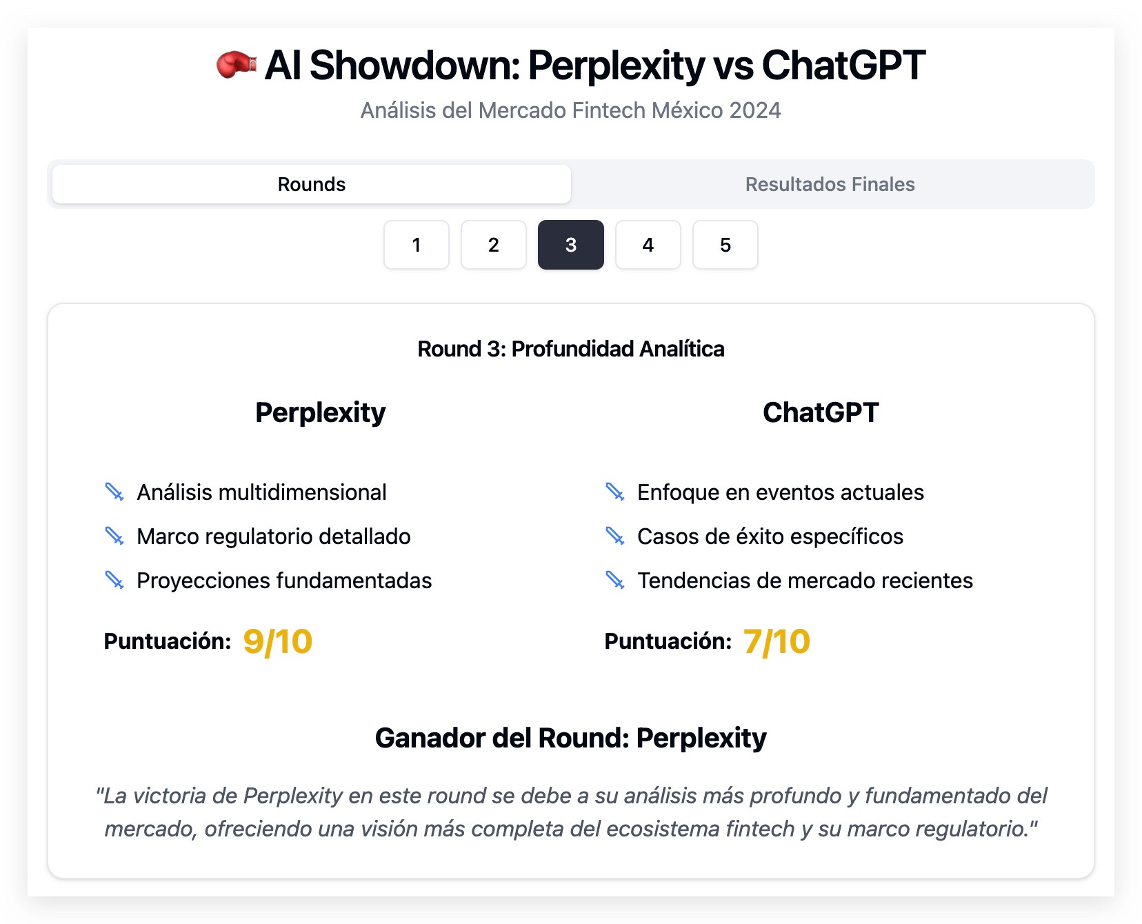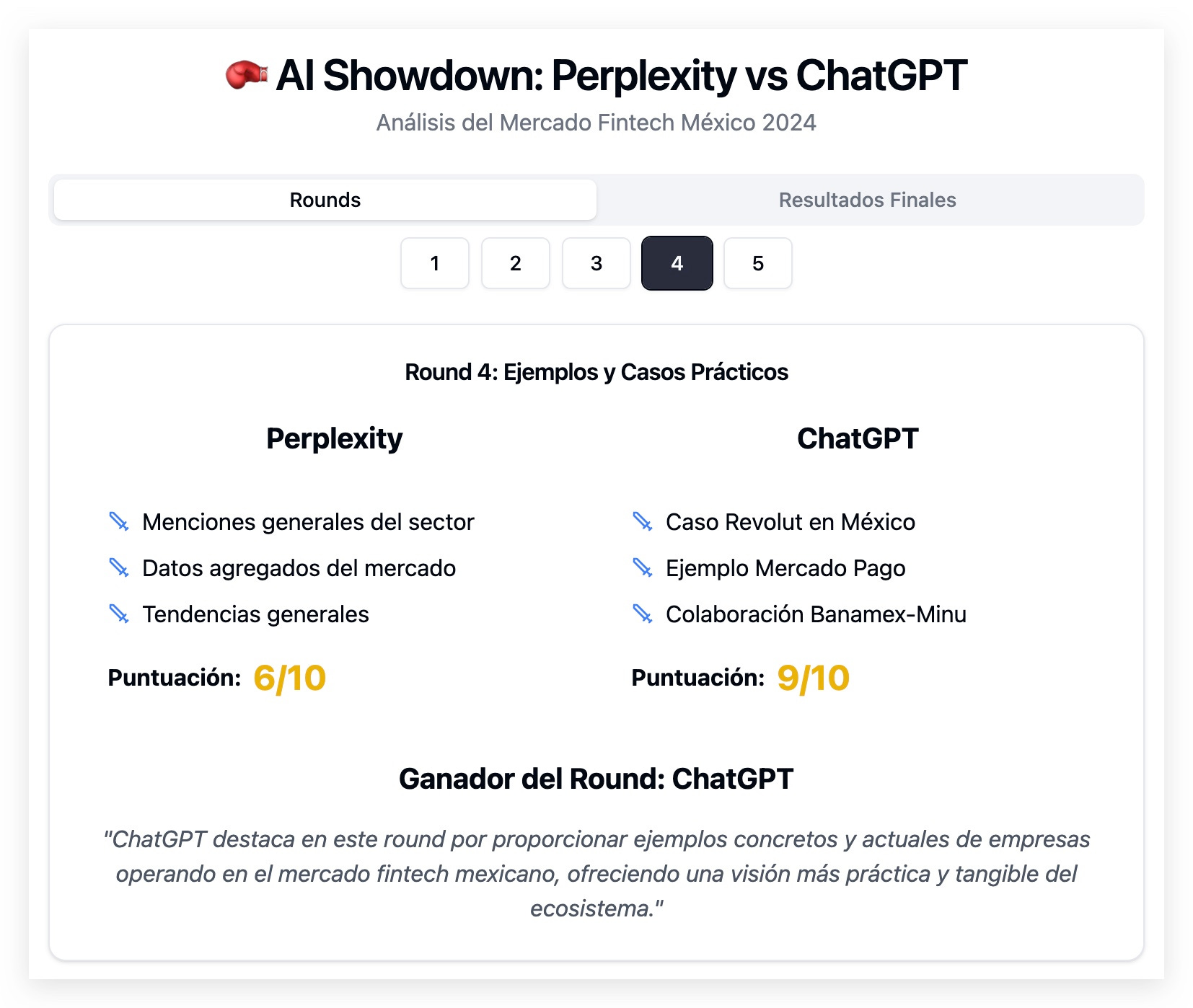 Esta dinámica se repitió en diferentes contextos. ChatGPT Search destaca en "momentos de decisión rápida" - cuando necesitas verificar un dato, confirmar una estadística u obtener una respuesta concisa. Perplexity, por su parte, brilla con "momentos de reflexión" - cuando necesitas entender el panorama completo, explorar diferentes perspectivas o construir un argumento sólido basado en múltiples fuentes.