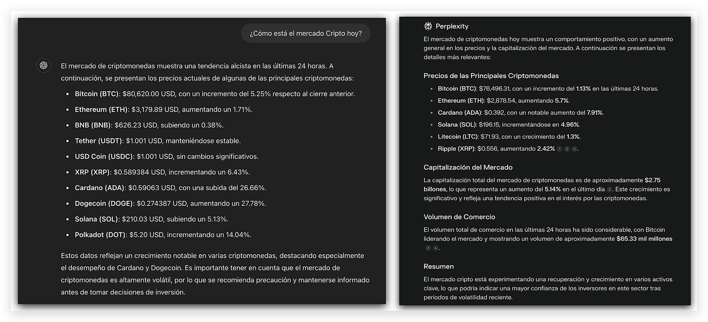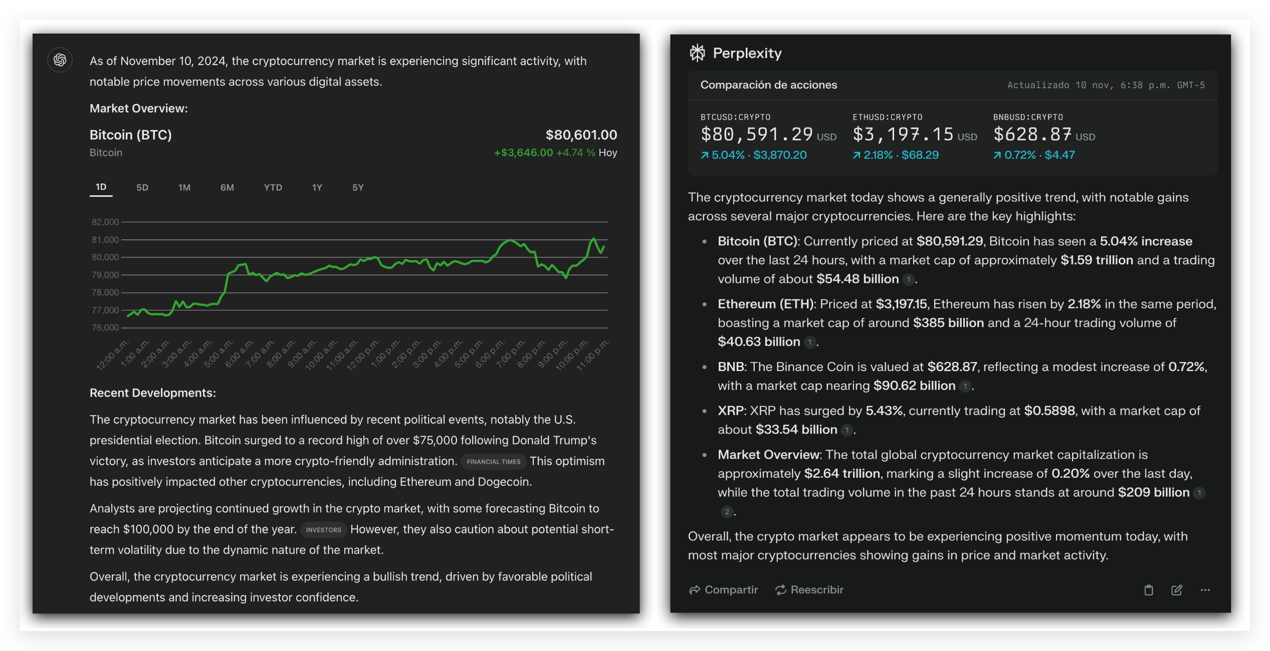 Después de las elecciones en Estados Unidos, surgió una discusión sobre las tendencias del mercado cripto, una buena oportunidad para comparar ambas herramientas. Inicié haciendo una pregunta abierta: "¿Cómo está el mercado cripto hoy?". En ese escenario, encontré un dato crucial: